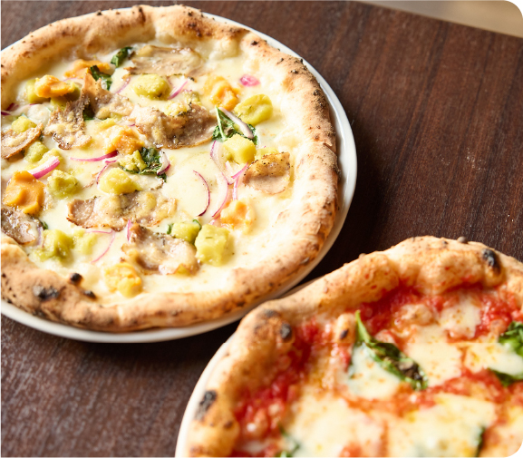 「Garden Pizzeria IZAEMON」ではナポリのイスキア島で修行したピザ職人が、地元ブランドのさつま芋「富の川越いも」やみよし野菜、自家農園産のハーブを素材にした料理を提供します。