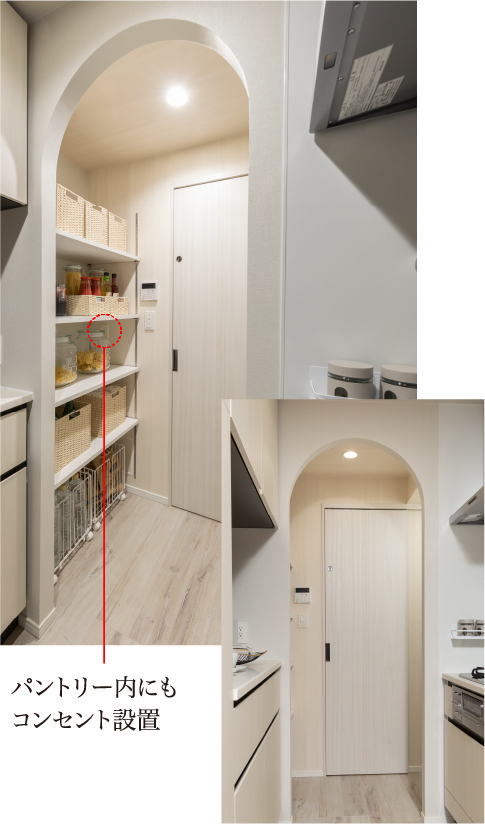 食品のストックや調理家電の保管場所などにも便利な収納棚付きのパントリーをご用意。リビングにいるゲストから見えない位置に冷蔵庫が置けます。 ※一部タイプ除く。