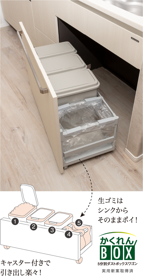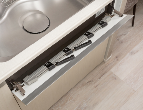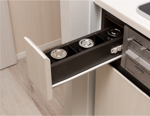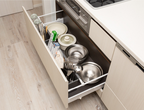 お鍋のフタや菜箸などのさまざまなサイズに対応したパーティション付の収納空間をコンロ下に確保。より快適に仕分けや取りだしができます。