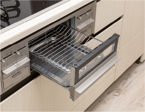 水のいらない両面焼きワイドグリルで、大きめの食材も素早く、こんがり焼き上げます。グリルを従来より長く引き出せるため、食材の出し入れもラクラク。