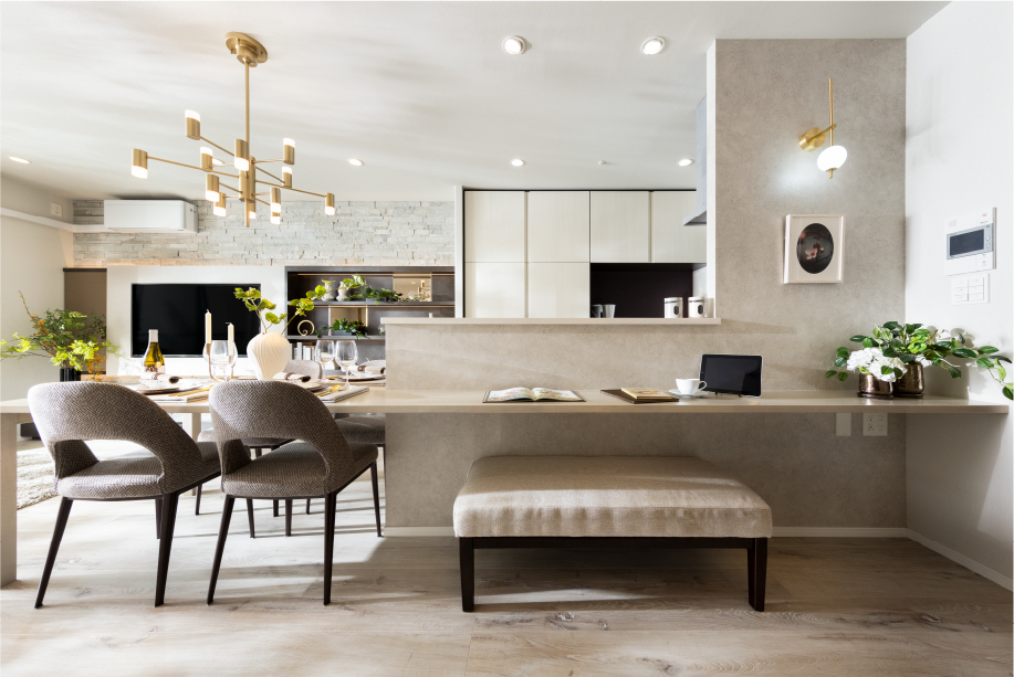 キッチンとテーブルが繋がっているので、お菓子作りや夕食の準備も家族一緒に楽しめます。