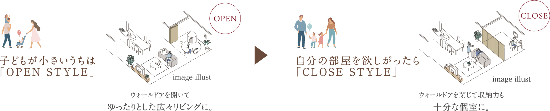 お子様の成長に合わせて、BED ROOM(3)を独立した子ども部屋に。変身クロークをデスクとして利用して学習習慣をサポートします。またBED ROOM(2)はご夫婦のトレーニングやヨガ、お子様も一緒に体を動かせるウェルネス空間として活用できます。
