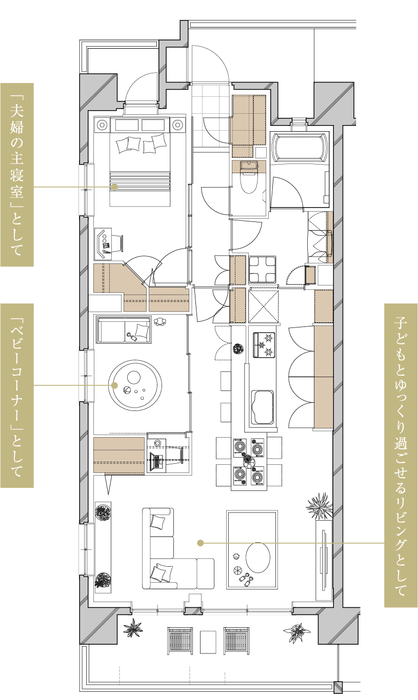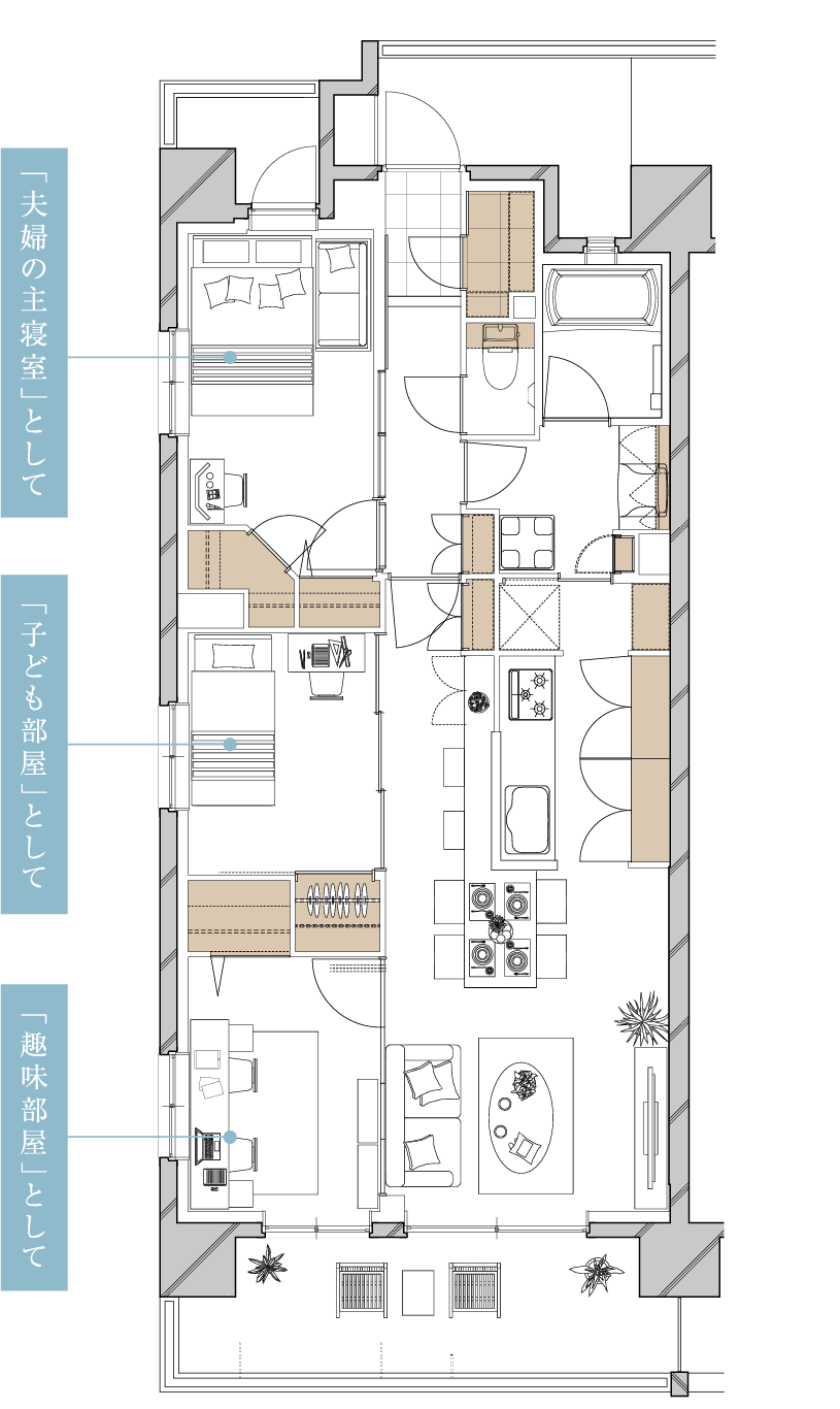 お子様を迎える際は、住まい全体を子育てしやすい空間へ再編。キッチンから見守れるBED ROOM(3)をベビーコーナーに活用し、BED ROOM(2)はLDKと繋げて親子でのびのび過ごせる一体空間として利用できます。主寝室にはベビーベッドを置いて、夫婦交代で子守もしやすい住空間です。