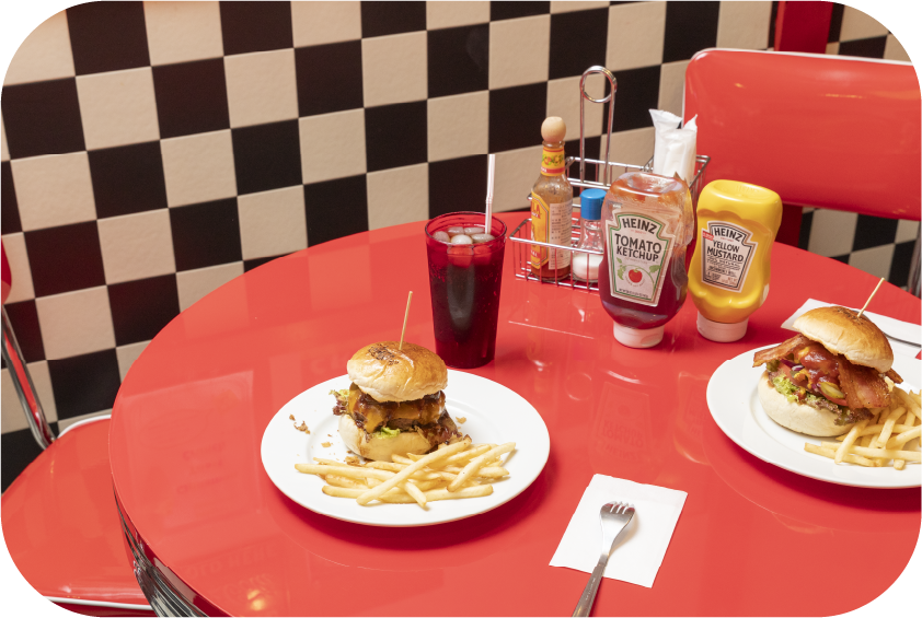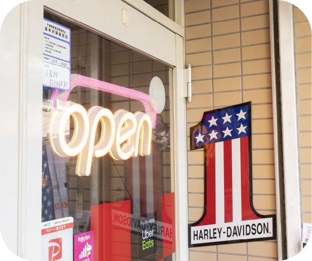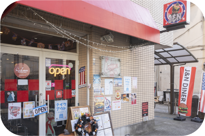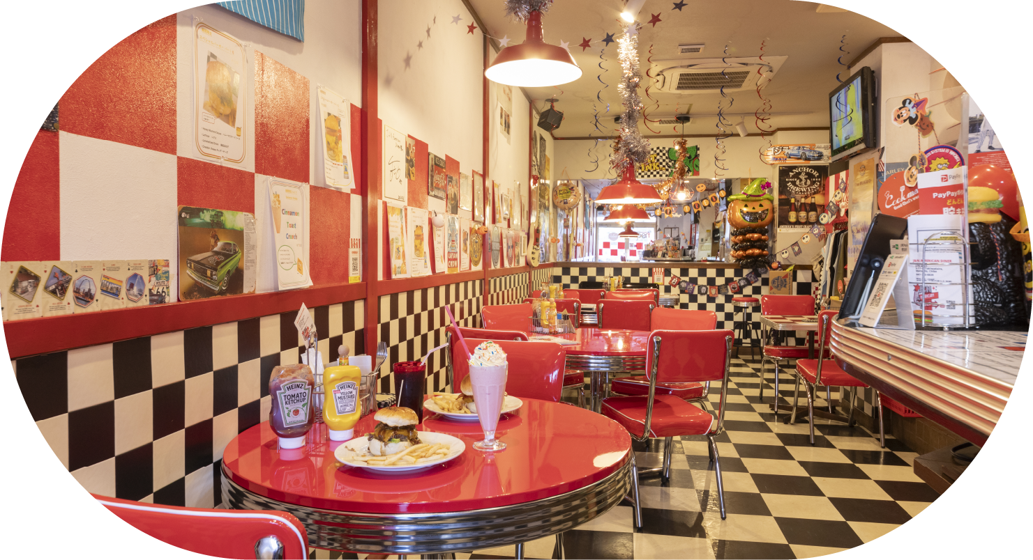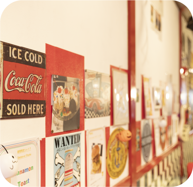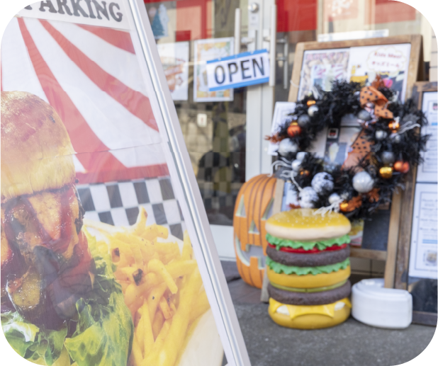 お店を賑やかに装飾してます。都心からも近いので、SNSでも映えるアメリカンなハンバーガーを一度味わって欲しいです。お散歩がてら、美味しい時間をお届けしますので、ぜひご来店ください。